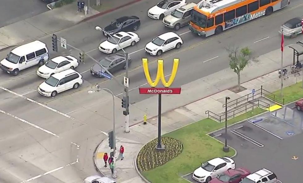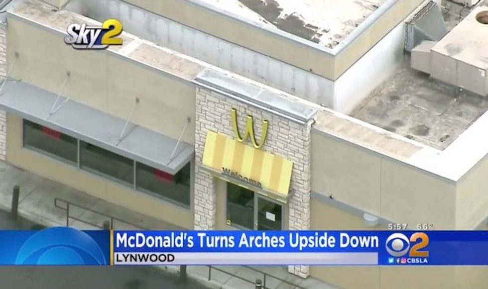 A McDonald's in the Los Angeles area flipped its iconic golden arches upside-down to celebrate International Women's Day, which takes place Thursday. (Image source: KCAL-TV video screenshot)
