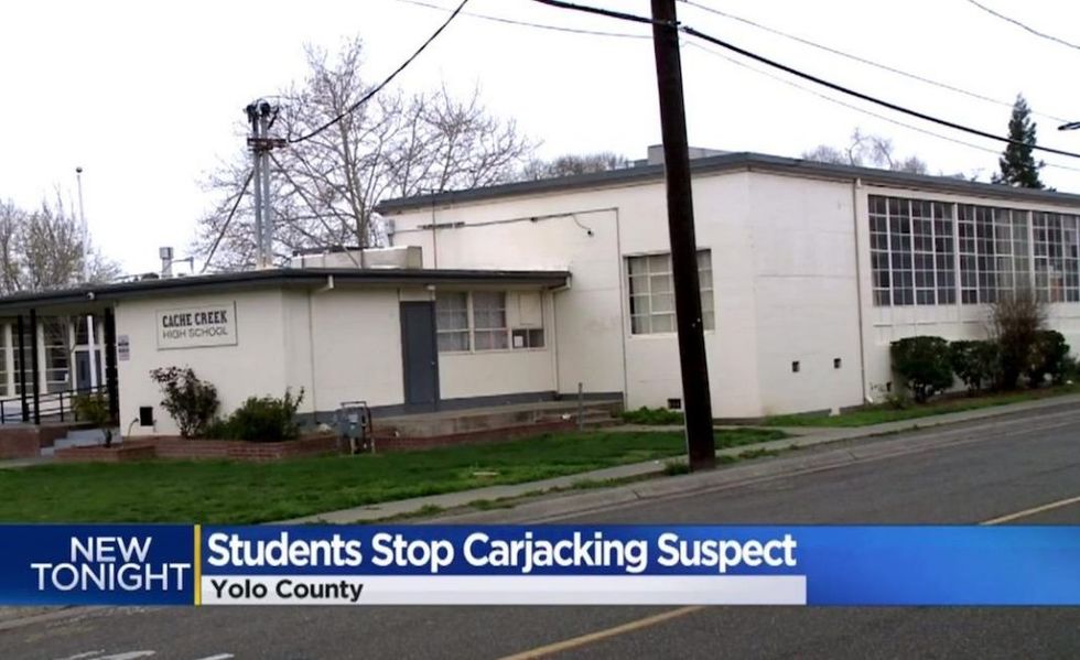 When they saw a man trying to pull their classmate out of her car Tuesday, three male students from Cache Creek High School in Yolo, California, came to the rescue. (Image source: KOVR-TV video screenshot)