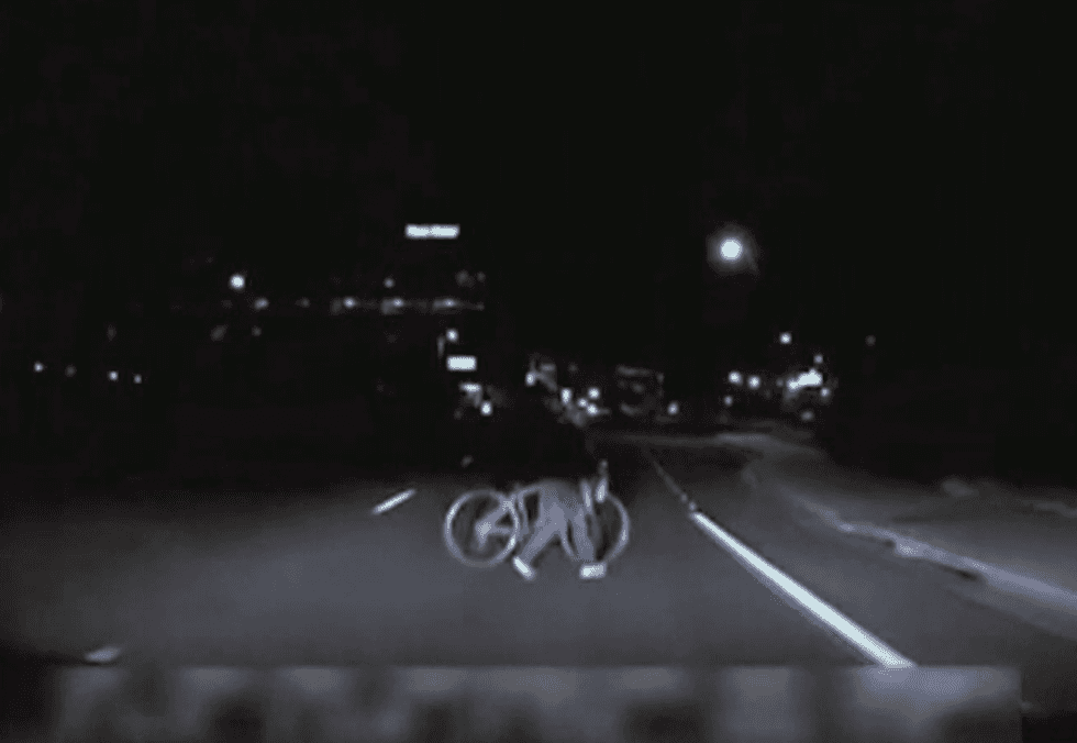 The footage freezes a split second before the actual collision between the vehicle and the pedestrian, 49-year-old Elaine Herzberg, who is pushing a bicycle across a dark, unlit highway.