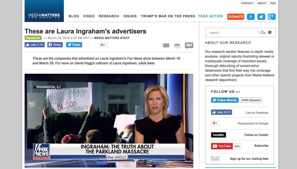 Ingraham published her tweet on a Wednesday. By the following day, Media Matters, a far-left media watchdog also funded in part by George Soros, published a list of companies that had advertised on Ingraham’s show in the preceding week. Other liberal activists circulated lists online, while Hogg himself pointed people to Media Matters’ list and encouraged them to apply pressure.