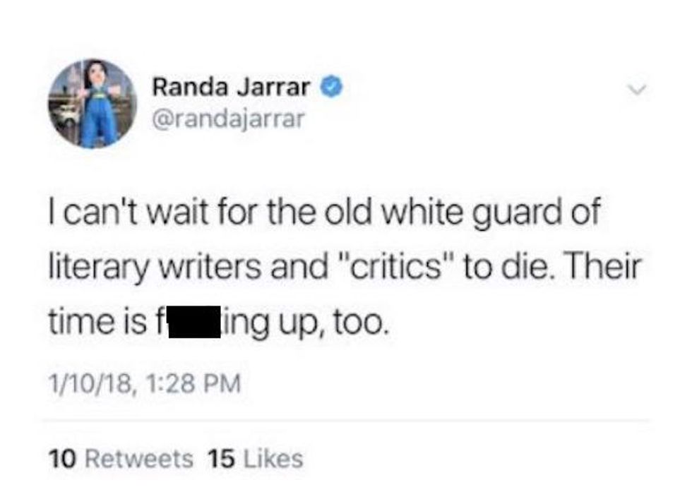 "I can't wait for the old white guard of literary writers and 'critics' to die. Their time is f***ing up, too," she wrote.