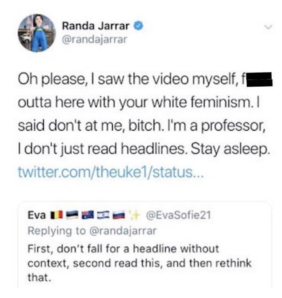 She wrote to another Twitter user to get the "f*** outta here with your white feminism. I said don't at me bitch. I'm a professor, I don't just read headlines. Stay asleep."