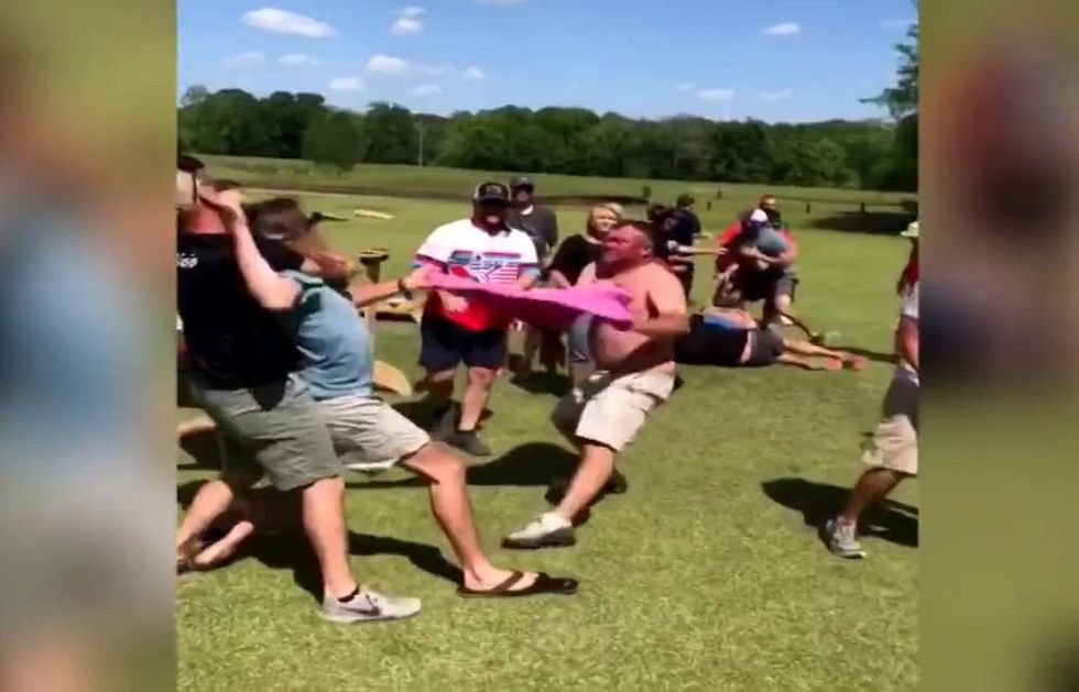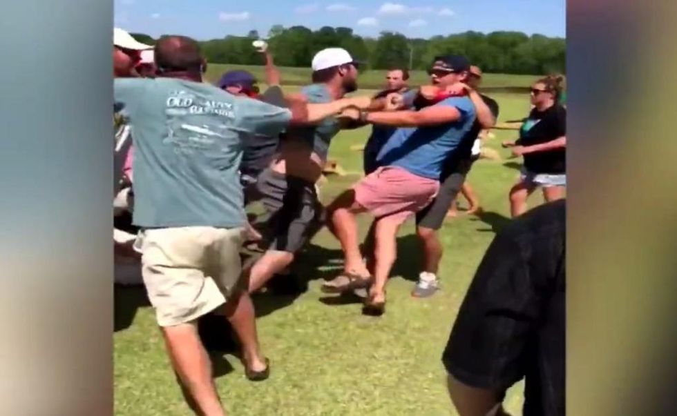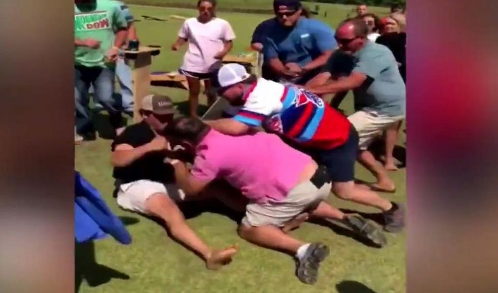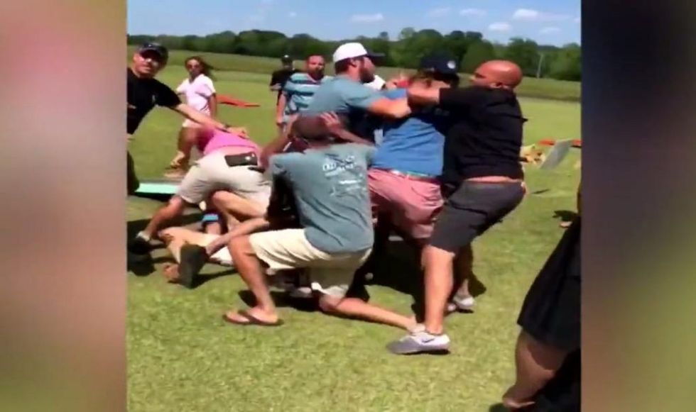 An all-out brawl broke out at a cornhole tournament fundraiser Sunday at a posh Georgia resort. (Image source: WSB-TV video screenshot)