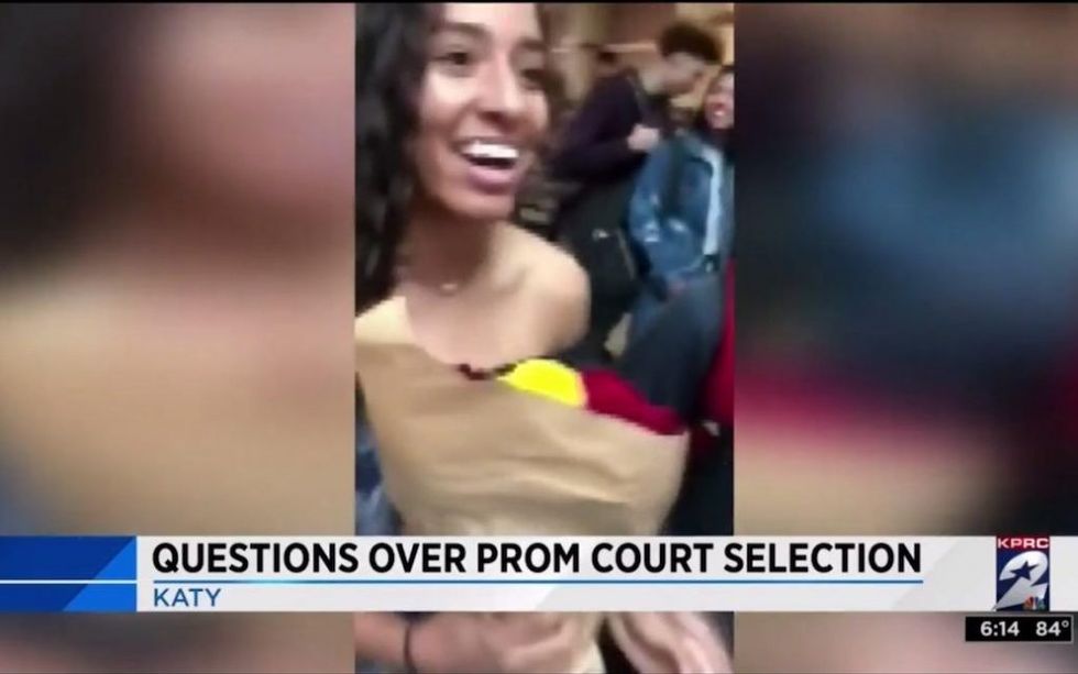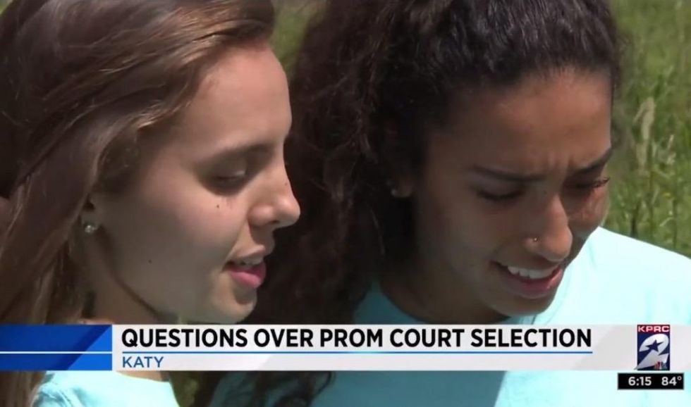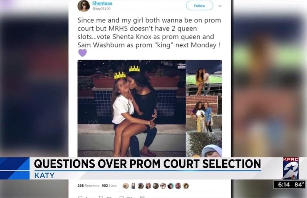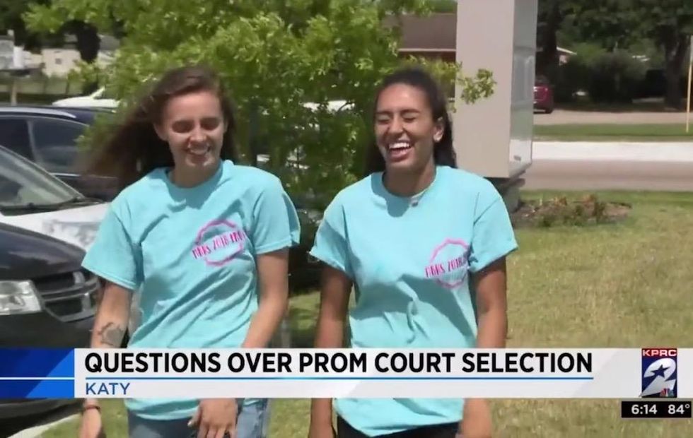 A high school lesbian couple in Texas wondered if bigotry costed them spots on prom court. Then the truth emerged. (Image source: KPRC-TV video screenshot)