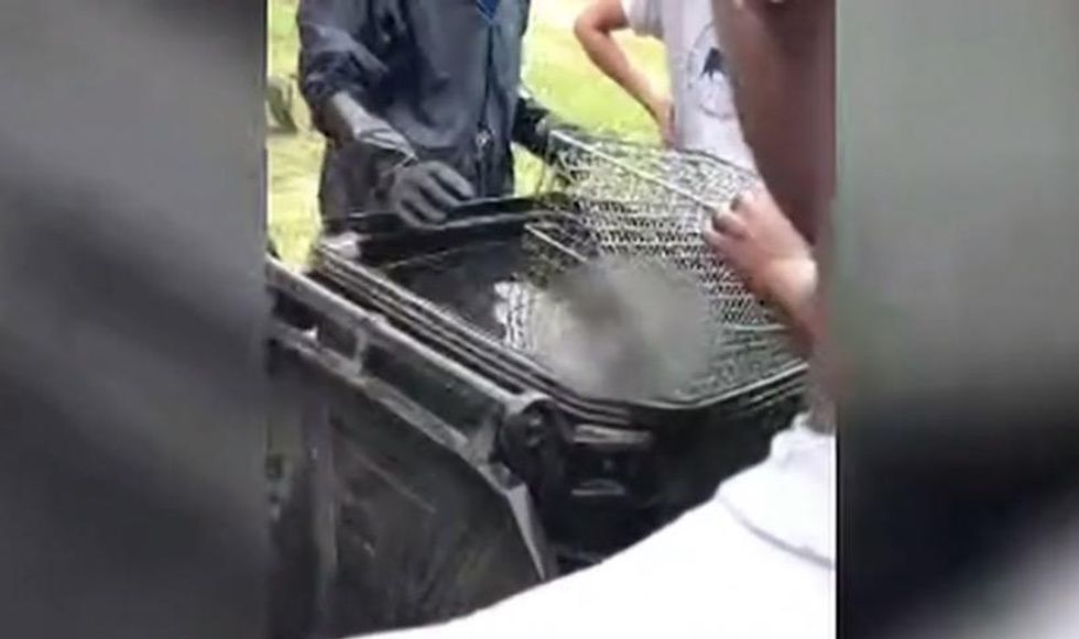 "Why is he not fighting?" one person in the video asked as the raccoon sits in the trap in the trash bin filled nearly to the brim with water, the station added.