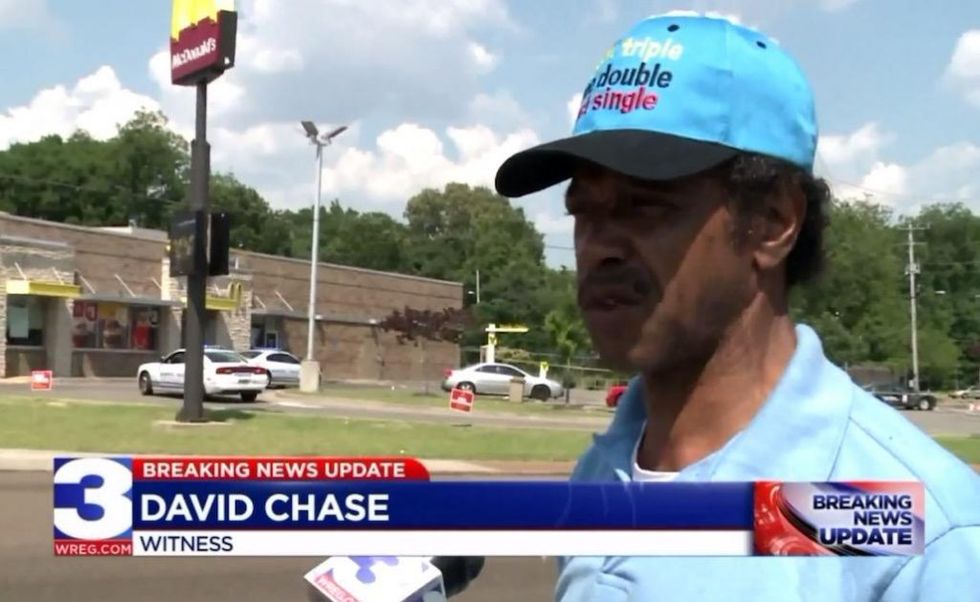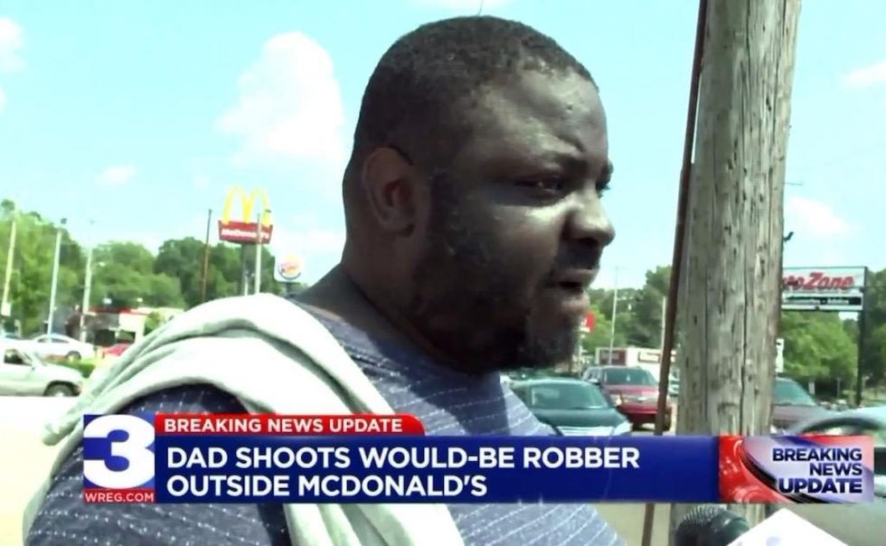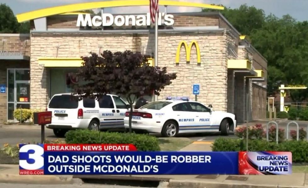 A dad holding his baby daughter was attacked by four men in a McDonald's parking lot in Memphis, Tennessee, on Tuesday afternoon. But Dad fought back — and added some firepower as well. (Image source: WREG-TV video screenshot)