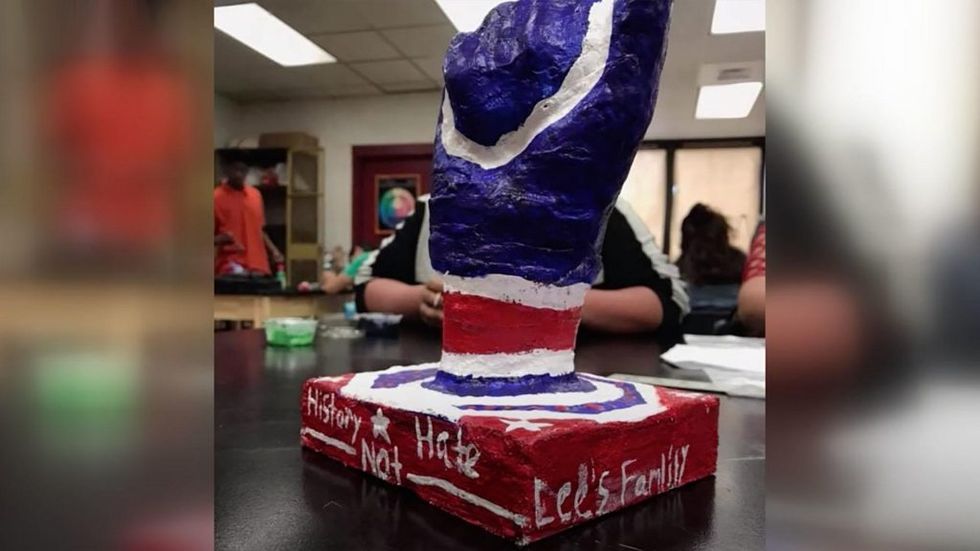 According to the outlets, the project was "a ceramic sculpture of a hand with 'Robert E. Lee, history not hate.'" The sculpture also bore a Confederate flag.