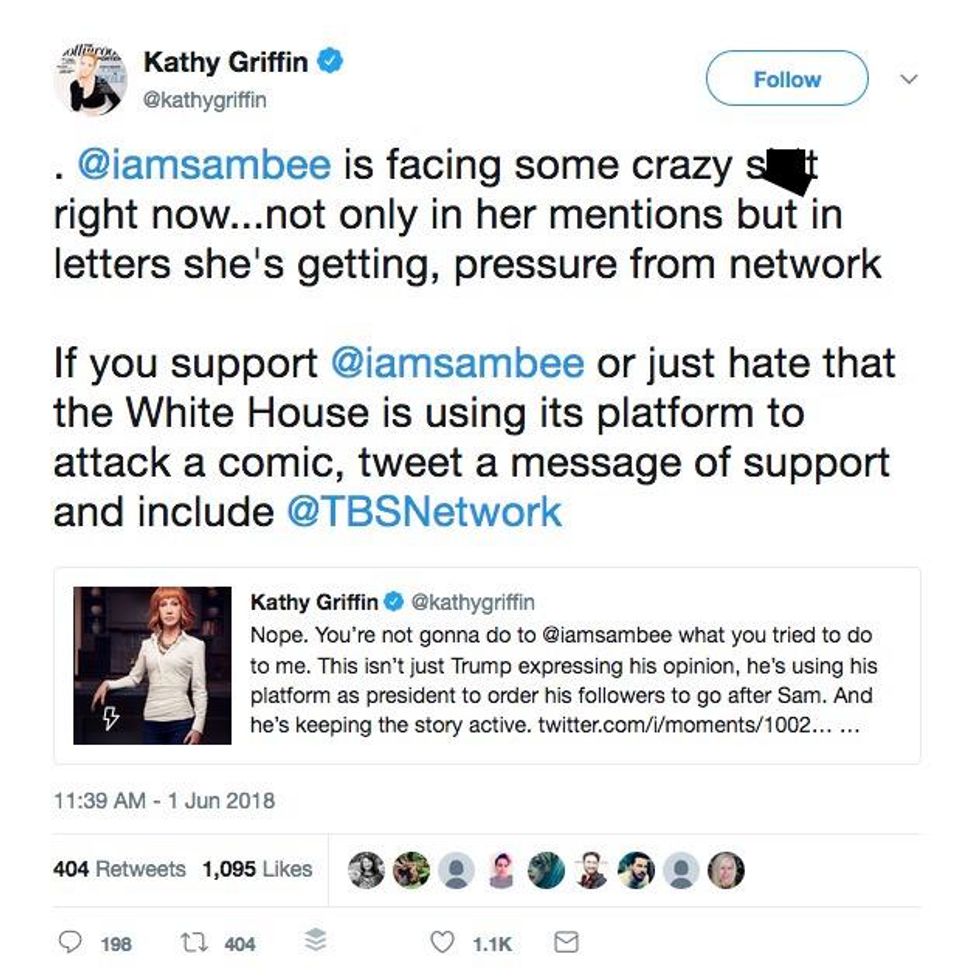 Griffin said Bee is "facing some crazy s**t right now...not only in her mentions but in letters she's getting, pressure from network" and that "if you support [Bee] or just hate that the White House is using its platform to attack a comic, tweet a message of support and include [TBS]."
