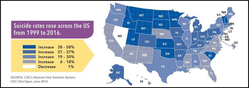 Suicide is a leading cause of death in the U.S. In 2016, nearly 45,000 people were lost to suicide. And over the last 18 years of available data, suicide rates increased more than 30 percent in at least half of the states, according to the June issue of the CDC publication, Vital Signs.