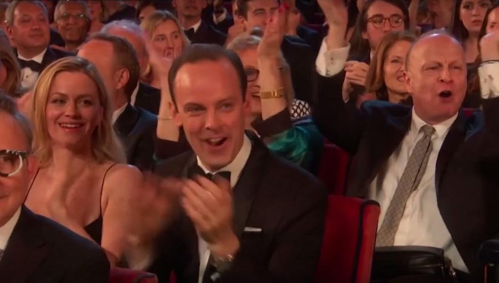Legendary actor Robert De Niro walked onstage at the Tony Awards Sunday night told the crowd, "I'm gonna say one thing: F*** Trump." The audience responded to De Niro's words with a thunderous standing ovation.  (Image source: YouTube screenshot)