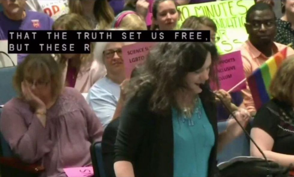A woman — her voice breaking at one point as she spoke to the board — said the proposed curriculum change will "imprison students in half truths and lies ... 'biological sex' is not a mistake, it's not a stigma, it's not a choice."