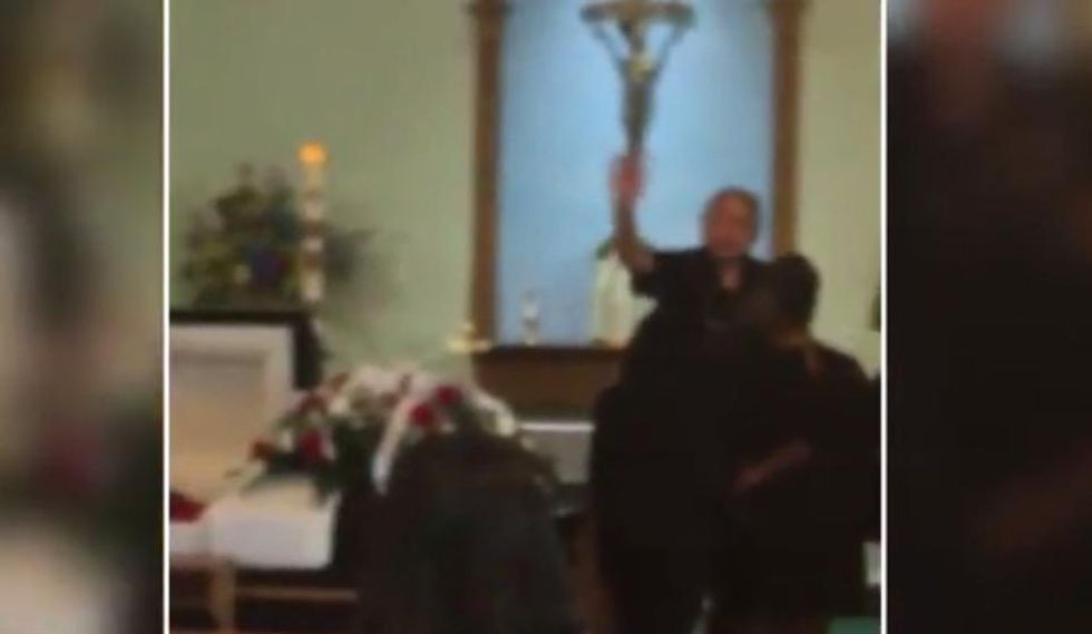 A Catholic priest in Maryland went ballistic on a grieving family during a funeral last week. The archdiocese has issued an apology. (Image source: WTTG-TV video screenshot)