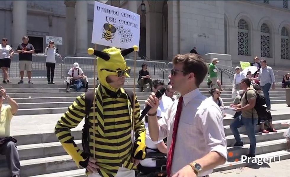 When a fellow dressed up like a bee was asked if there should be open borders, he replied with an observation one might not expect from a guy dressed up like a bee, calling borders "kind of a construct, so in a sense they are open."