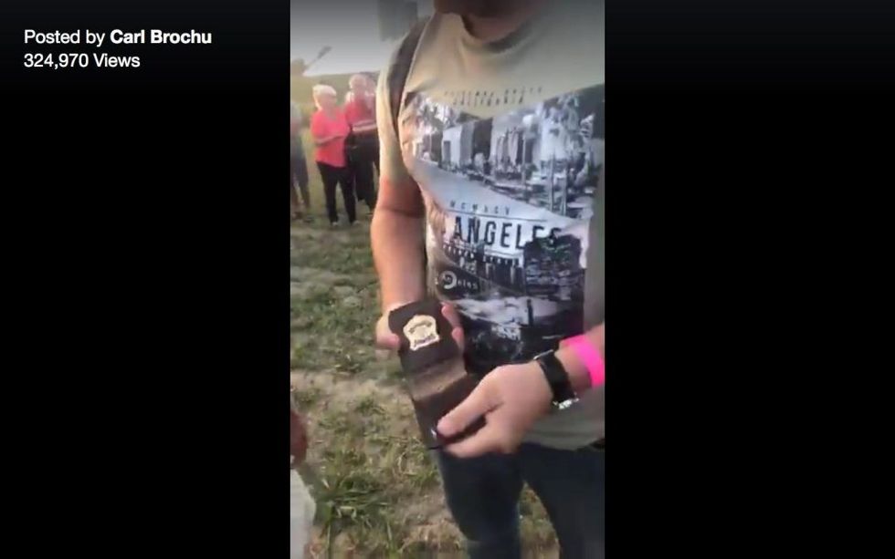 Here's the full video. The part featuring the man with the badge holding the woman's arm starts at around the 3:45 mark: