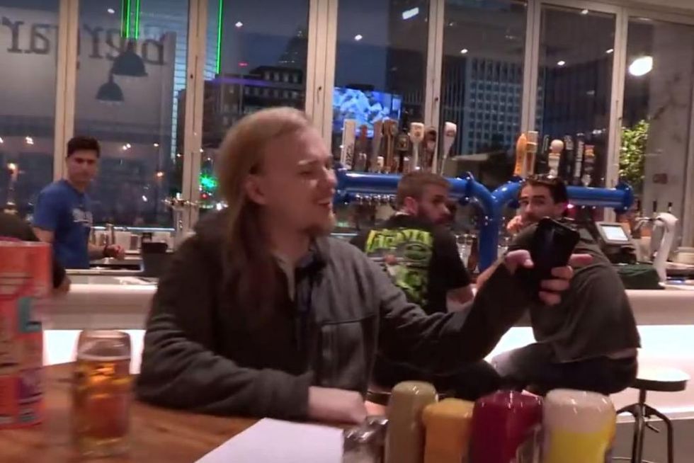 On the day of the protest — which the leftist cancelled over rainy conditions — Crowder and his video crew showed up, got the guy on the phone posing as a fellow left-wing activist, and arranged a meet-up at a beer garden.