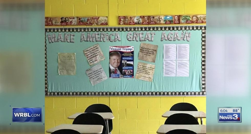 A school is under fire after one of its teachers put up a class bulletin board featuring a photo of President Donald Trump along with his campaign slogan, "Make America Great Again." (WRBL-TV video screenshot)