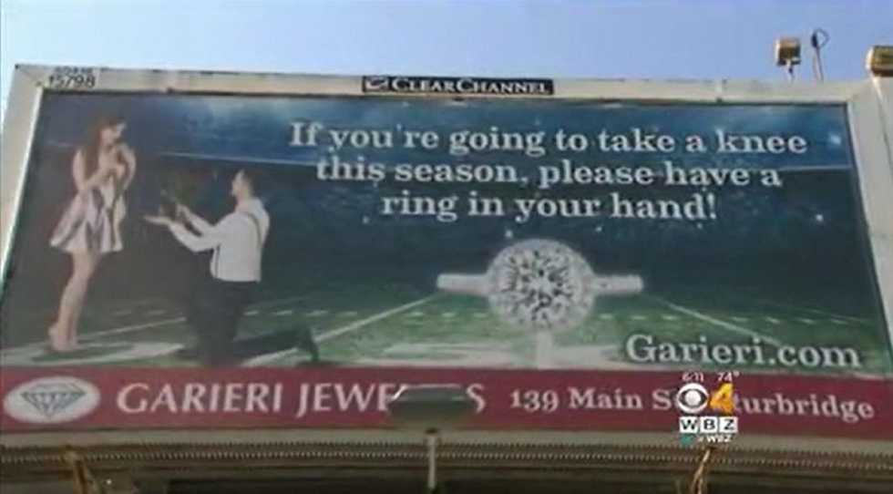 Scott Garieri, owner of Garieri Jewelers in Sturbridge, recently put up a billboard showing a man proposing to his sweetheart on a football field. The message on the ad reads: "If you're going to take a knee this season, please have a ring in your hand!"