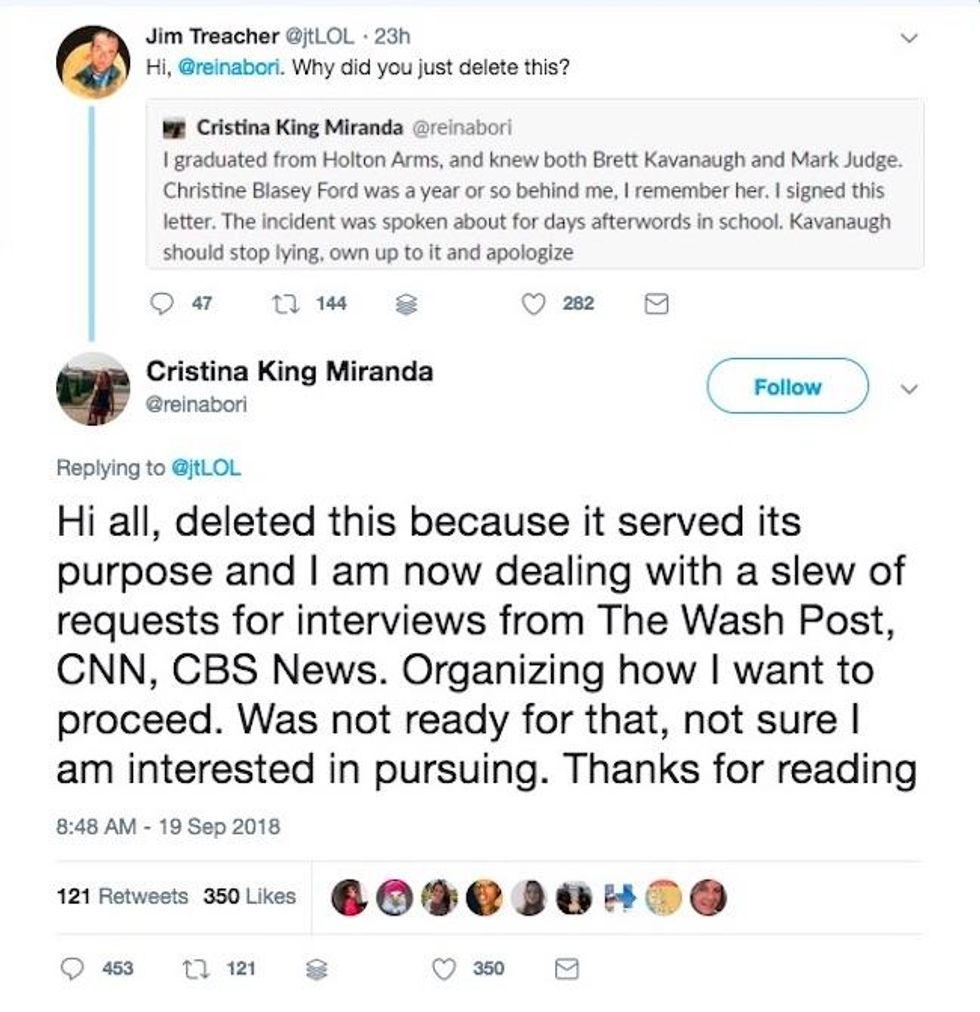 Miranda deleted her post that backed Ford's allegations against Kavanaugh and followed it with another post that said she was "dealing with a slew of requests for interviews" from several news outlets.