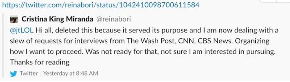 "Hi all, deleted this because it served its purpose and I am now dealing with a slew of requests for interviews from The Wash Post, CNN, CBS News. Organizing how I want to proceed. Was not ready for that, not sure I am interested in pursuing. Thanks for reading," she wrote.