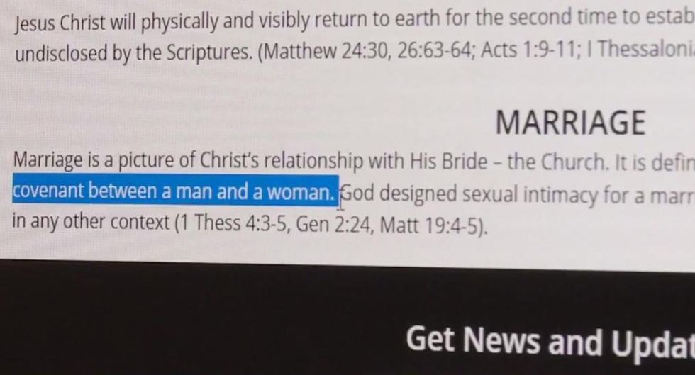 The church's website notes: "Marriage is a picture of Christ’s relationship with His Bride – the Church. It is defined from the beginning of Scripture as a lifelong covenant between a man and a woman. God designed sexual intimacy for a marriage relationship and does not endorse or condone it in any other context (1 Thess 4:3-5, Gen 2:24, Matt 19:4-5)."
