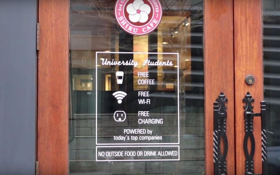 Shiru, which originated in Japan, explains on its website that "through a free drink we try to give students some information" from sponsor companies in order to broaden their "choices" regarding their future careers. Those sponsor companies "can have desired information projected on screens, which are tactfully arranged in our stores," the site notes, adding that companies also "can interact with students" at special Shiru events during which companies can "learn about studentsʼ academic interests and students’ start-ups."