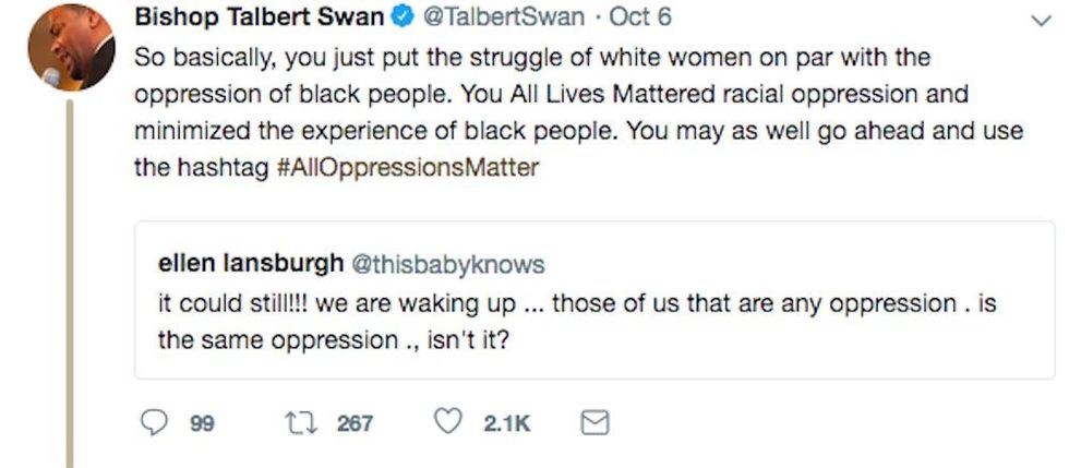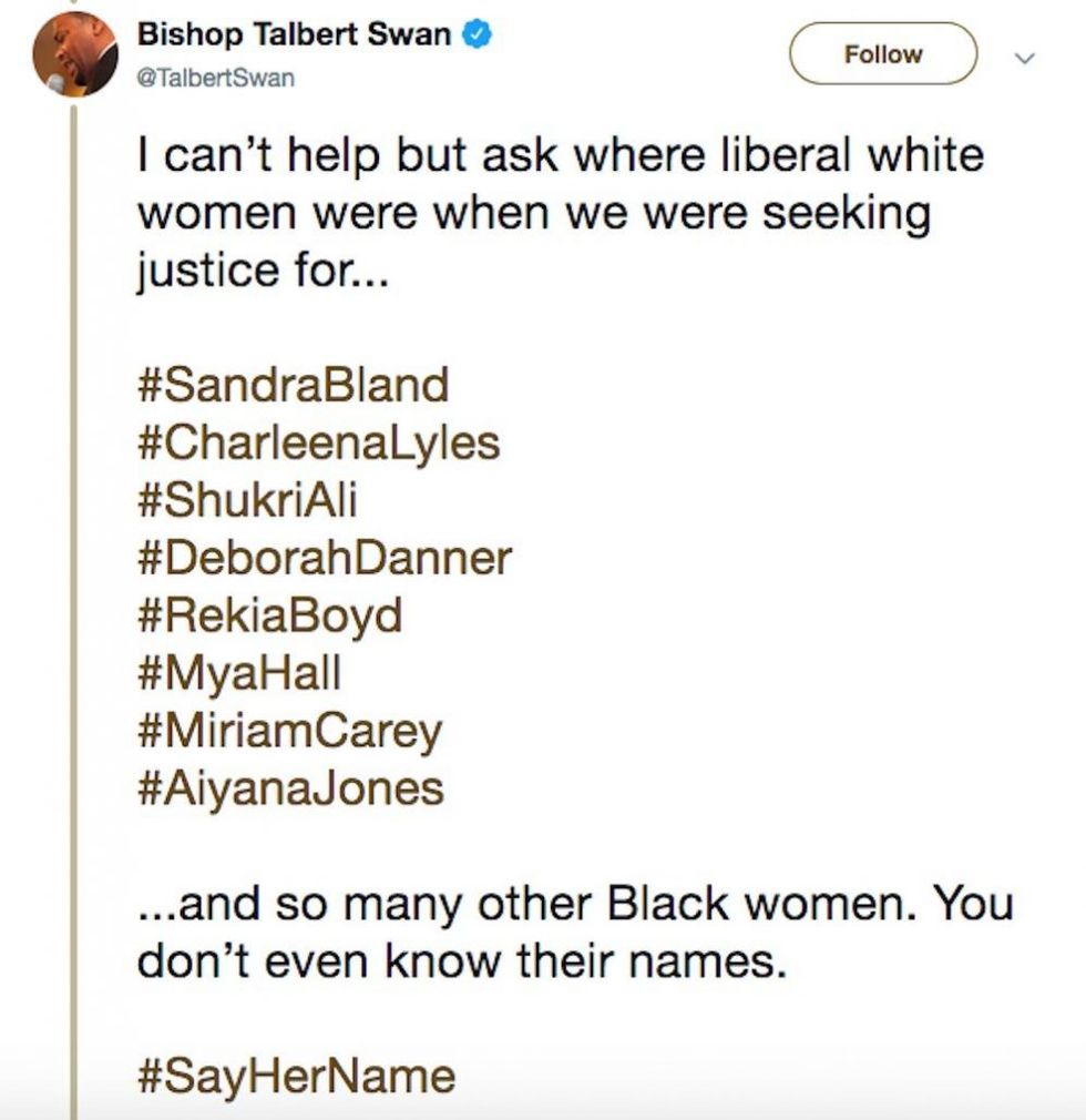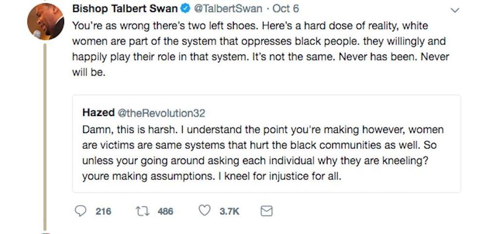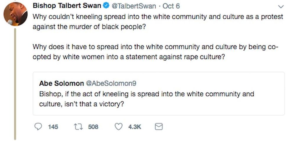 Bishop Talbert W. Swan II added the following in a tweet Saturday: "You didn’t kneel in solidarity to protest the murder of black people, don’t co opt & make it about your victimization. That’s white supremacy in the name of feminism"