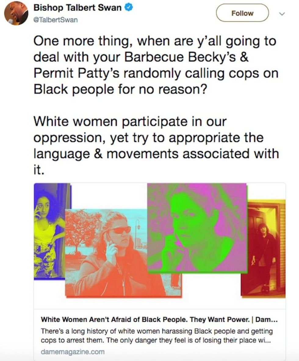 He also said "white women participate in our oppression, yet try to appropriate the language & movements associated with it" after calling out those who are "randomly calling cops on black people for no reason":