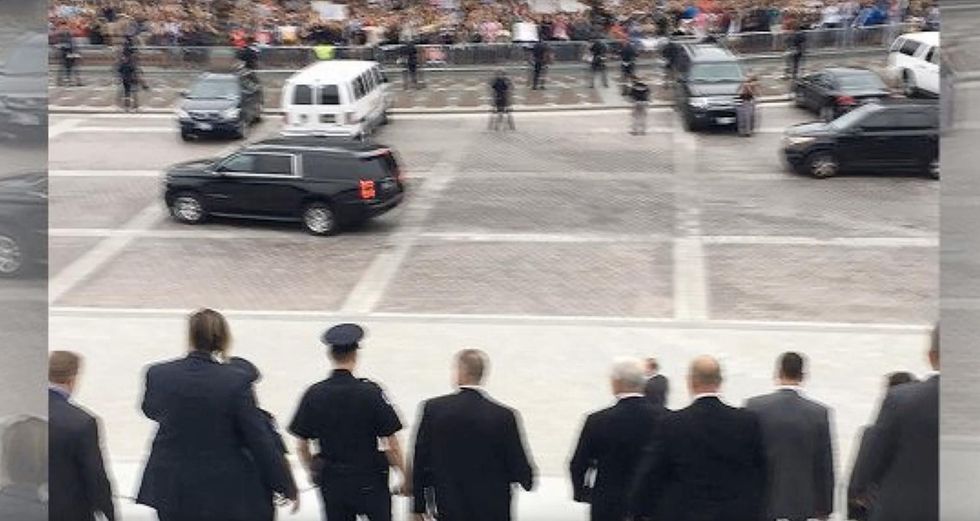 2) As Pence stands in doorway of Capitol at top of Senate steps, protesters across the plaza spot him and start shouting louder. His motorcade waits at the bottom of the Capitol steps.