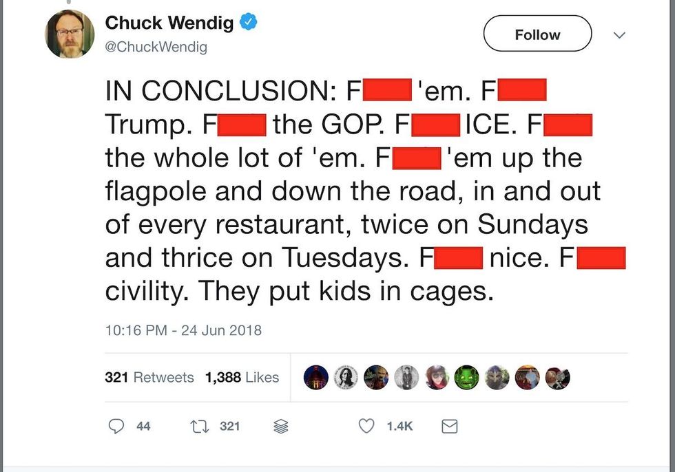 In one fiery tweet posted in June, Wendig tossed 8 f-bombs at Republicans over the reporting about child separations at the border. He specifically wrote, "F**k civility."