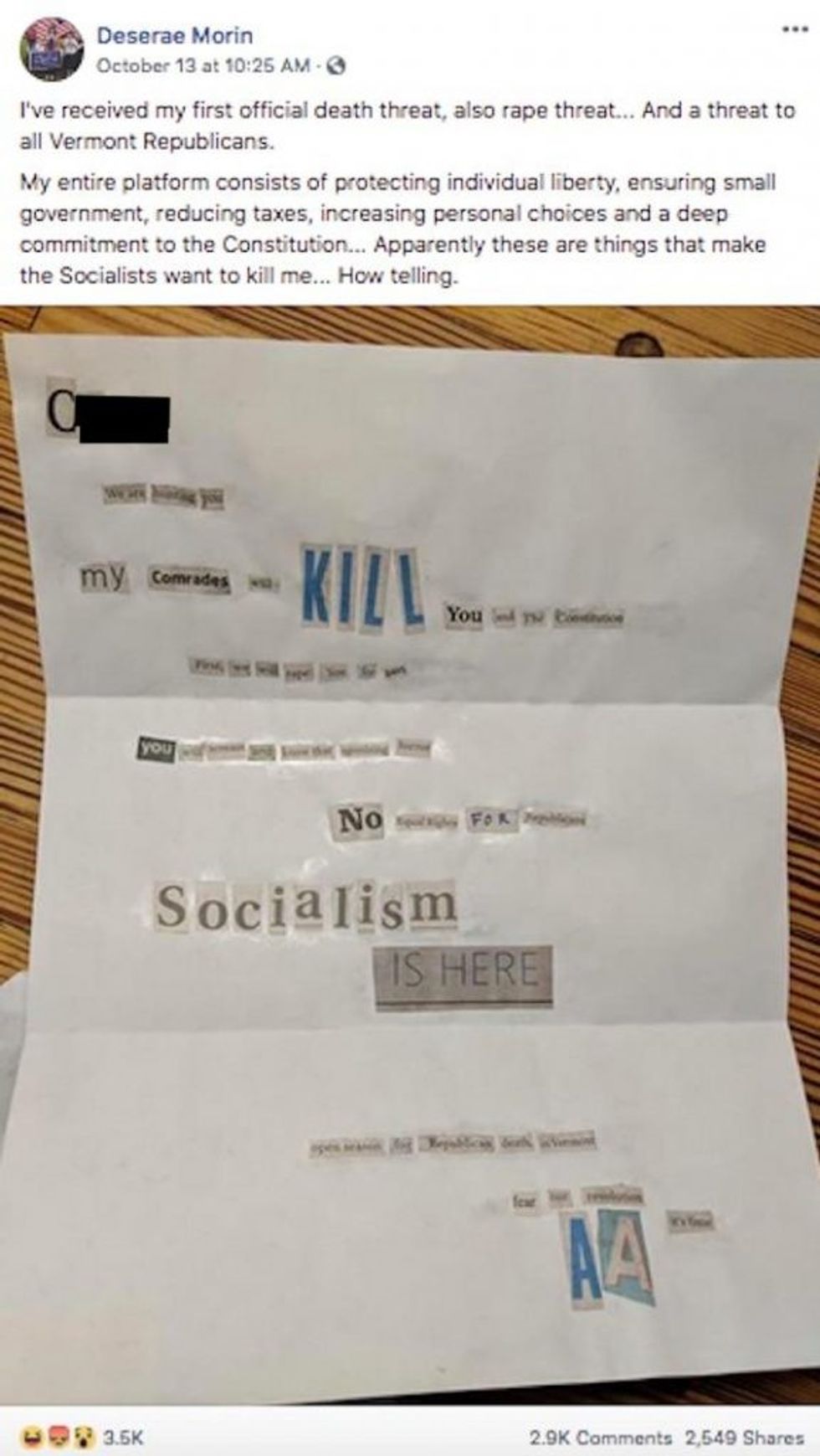 In a "cutout" word format, the letter begins "C***" and continues with, “We are hunting you. My comrades will kill you and the Constitution. First we will rape you for years. You will scream and know that agonizing horror. No equal rights for Republicans. Socialism is here. Open season for Republican death in Vermont. Fear our revolution. It's time." The letter, mailed to Morin's home in Colchester, is signed "AA."