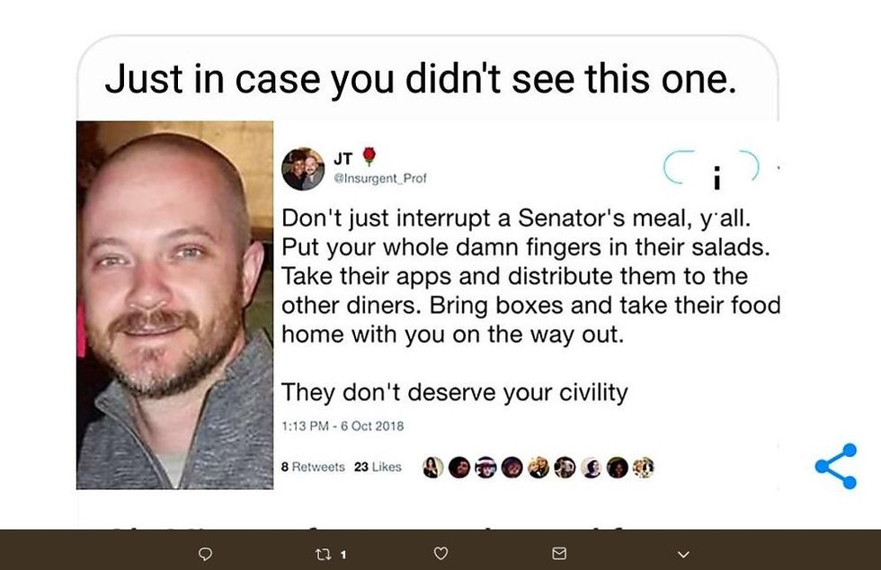 “Don’t just interrupt a Senator’s meal, y’all. Put your whole damn fingers in their salads. Take their apps and distribute them to the other diners. Bring boxes and take their food home with you on the way out,” Thomas tweeted Oct. 6, the day Judge Brett Kavanaugh was confirmed to the Supreme Court amid throngs of left-wing protesters who descended upon Washington, D.C. “They don’t deserve your civility.”