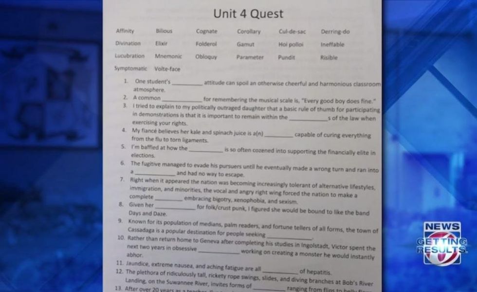 The wording of a vocabulary quiz in a Florida high school advanced English class — which slammed conservatives — left parents more than a little disturbed. (Image source: WKMG-TV video screenshot)