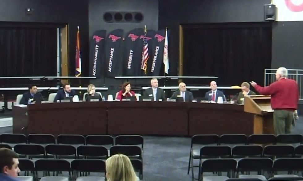 Furkin, 66, was seen on video giving a piece of his mind to the school board, noting to members that the decision to ban him from the school for bullying is akin to the board banning him from future meetings for complimenting one board member's hairstyle and another board member getting offended because he didn't compliment that other member's hairstyle.