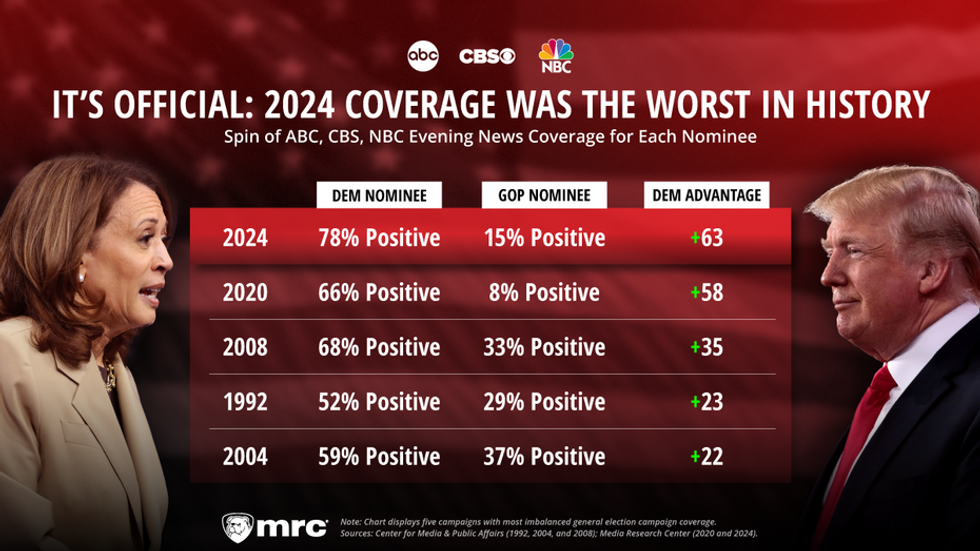 Media Research Center evaluated coverage of Harris on ABC, CBS, and NBC and found that 78% of the coverage for the vice president was positive versus 22% negative.