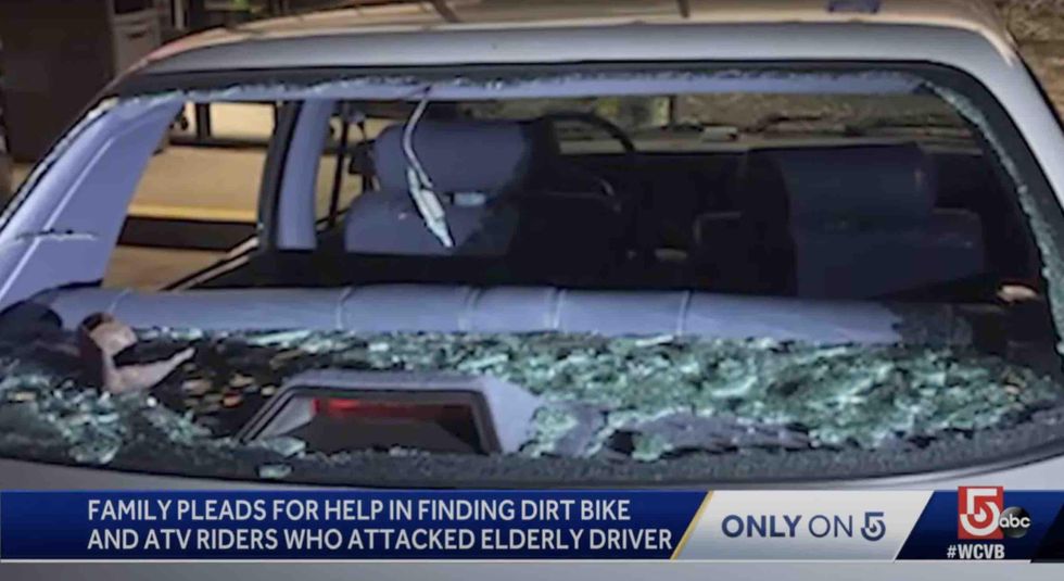 Simultaneously, other riders kicked the victim's car, threw a piece of pipe through the rear window and a large rock through another window, police told WCVB.