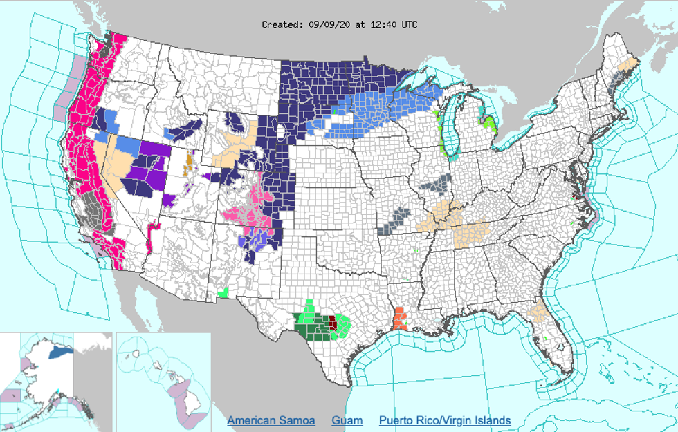 As of Wednesday morning, huge chunks of the country's West Coast, extending from the Canadian border in the north to the Mexican border in the south, were under "red flag warnings" (shown below in magenta), indicating critical fire conditions.