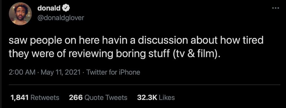 Early Tuesday morning, Glover took to Twitter where he wrote, "[S]aw people on here havin a discussion about how tired they were of reviewing boring stuff (tv & film)."