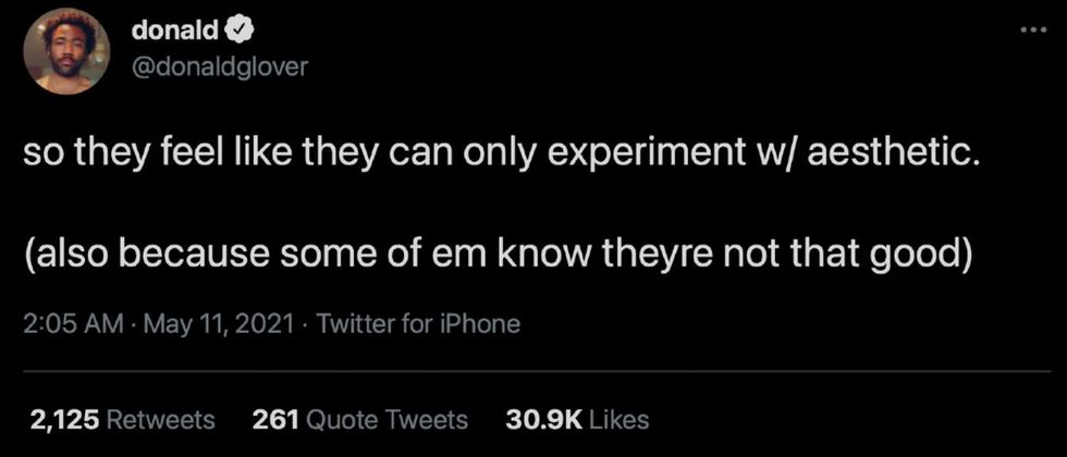 The 37-year-old entertainer concluded his thoughts, "So they feel like they can only experiment w/aesthetic (also because some of em know theyre not that good.)"