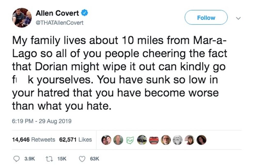 "My family lives about 10 miles from Mar-a-Lago so all of you people cheering the fact that Dorian might wipe it out can kindly go f**k yourselves. You have sunk so low in your hatred that you have become worse than what you hate," Covert said.