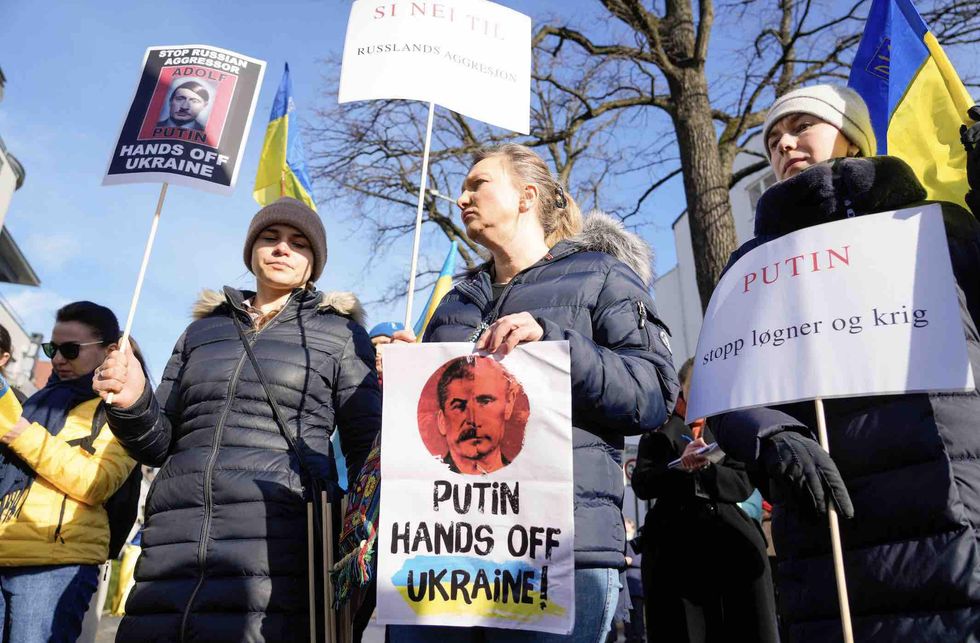 Protests against Russia's invasion also broke out in New York City, as demonstrators held signs showing Putin's face adorned with a blood-stained hand: