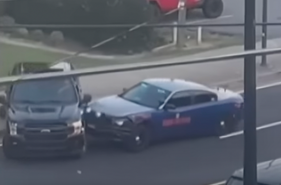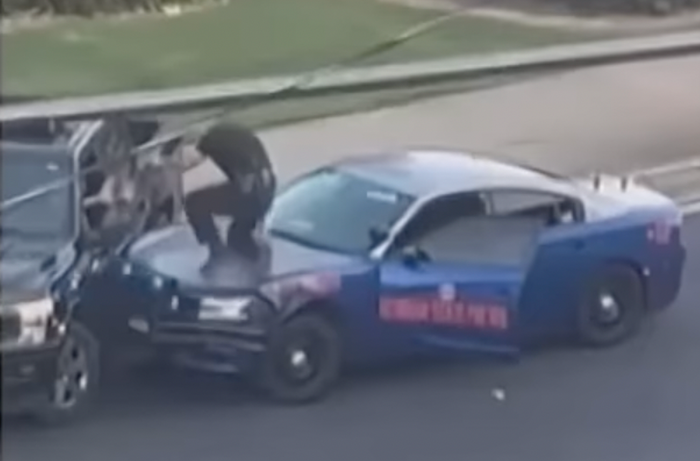 The trooper then exited the patrol car with his gun drawn, hopped atop the hood of the patrol car, and pulled the driver — who was holding his hands up — through the open window.