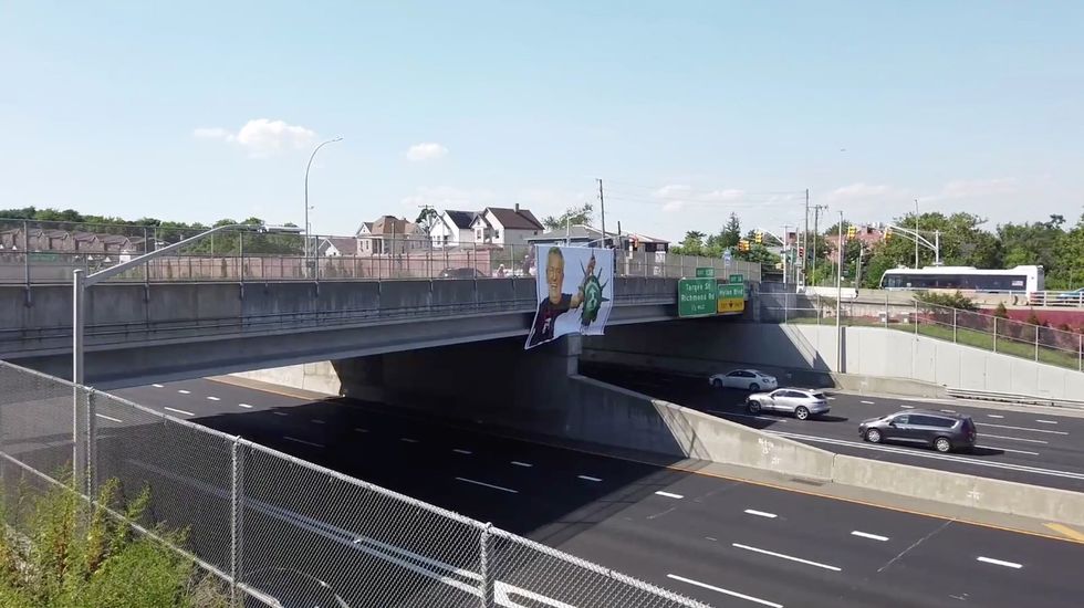 He first unfurled the artwork publicly over the busy Staten Island Expressway hoping to "fire up the masses," the New York Post reported.