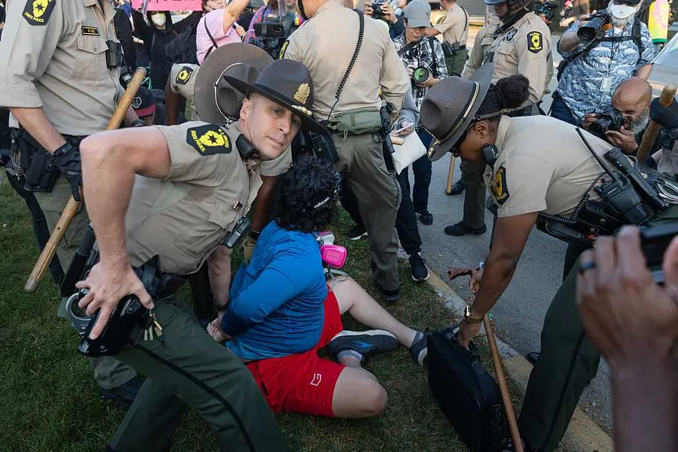 Local law enforcement officers worked to keep the road leading to the facility clear, confining protesters to designated areas. However, when some activists became violent and attempted to force their way into the street, officers began making arrests.