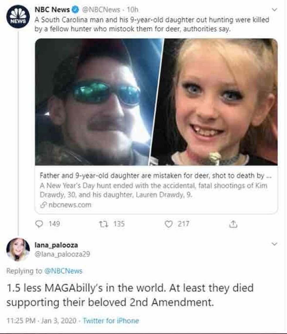 I don't believe in boycotting businesses for political positions — regrettably, that's a position progressives take. Sure, her close-minded political views triggered this reaction, but this tweet very clearly transcends a political view. This is about an utter lack of humanity, so deranged in an anti-Trump view, that anyone who hunts or lives in the south is somehow a "MAGAbilly"? And to extend that derangement to a 9-year-old girl? This is simply despicable.