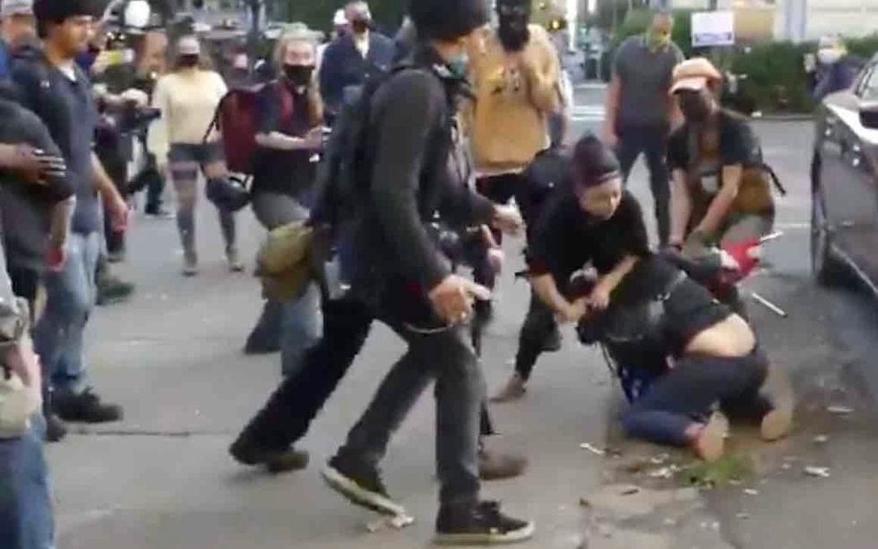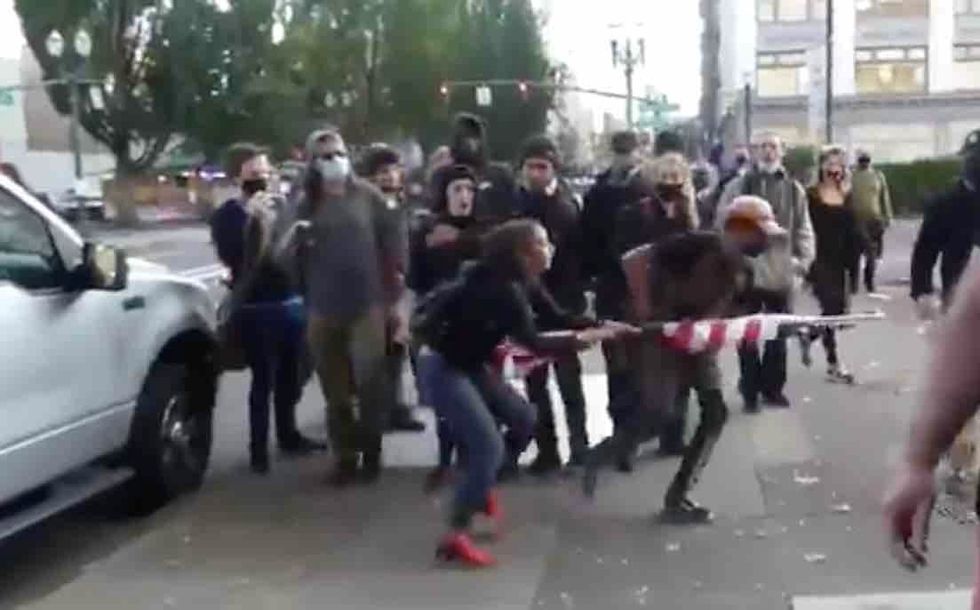 Antifa militants reportedly were caught on video Sunday ganging up on a woman of color and dragging her to a Portland, Oregon, sidewalk by her hair in an attempt to yank an American flag from her.