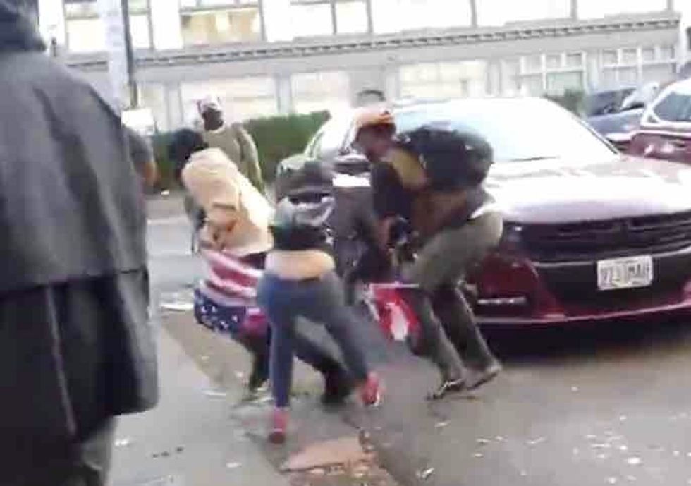 With that yet another leftist jumped in — a female apparently — and grabbed the flag-holding woman by her hair before dragging her down to the sidewalk. And the victim still wouldn't let go.