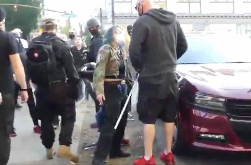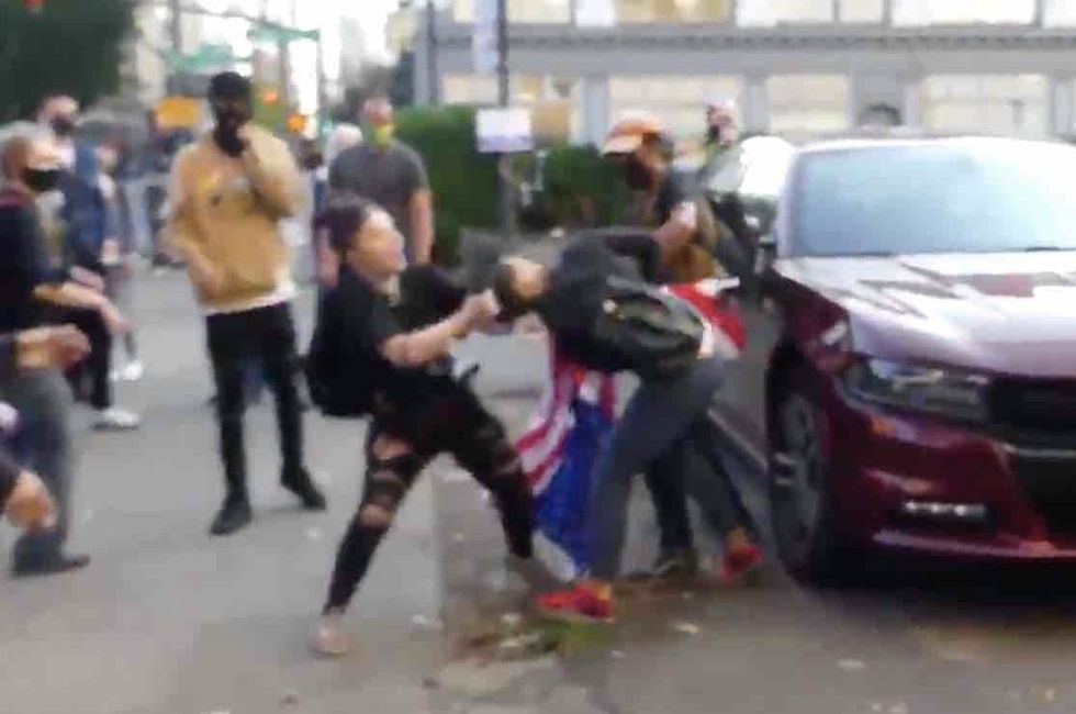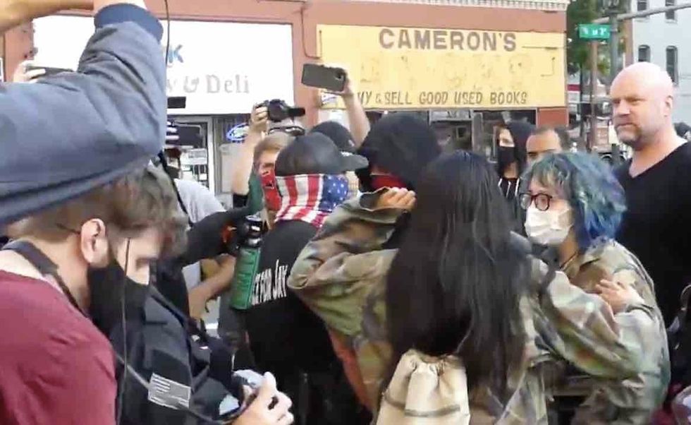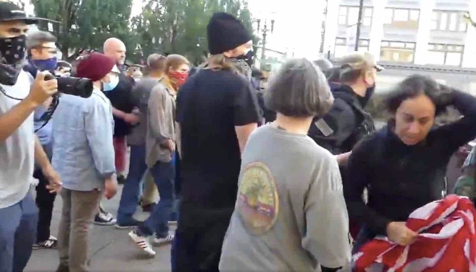 According to journalist Andy Ngo, Antifa attacked conservative demonstrators — one of who was a woman of color holding a U.S. flag. When one of the militants grabbed her flag pole from behind and tried to take it from her, she wouldn't let go.