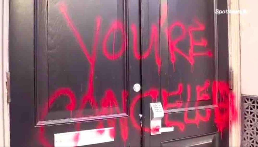 The club held its annual "Christmas and Hanukkah Social" on Thursday evening, but the cable network said when members arrived they saw anarchist graffiti and Antifa symbols spray-painted in red across the entrance to the building — along with the phrase, "You're canceled" on the dark double doors: