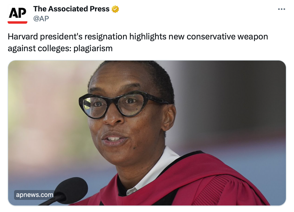 The Associated Press on Wednesday came under fire on social media over a story on Claudine Gay's resignation as president of Harvard — particularly the headline: "Harvard president's resignation highlights new conservative weapon against colleges: plagiarism."