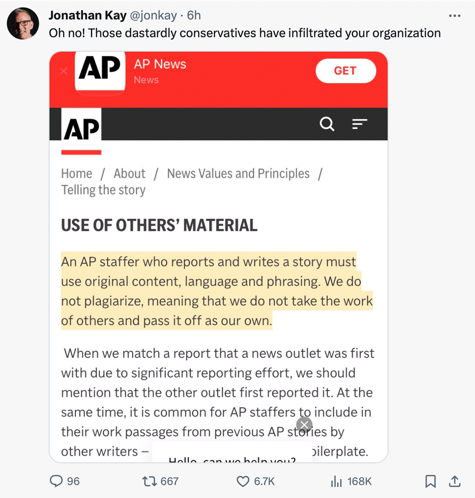 Tim Young had the following to say about the AP's initial headline: "Plagiarism is now a 'conservative weapon.' Just a reminder that Facebook/Meta uses this fake news org to 'fact check' people."